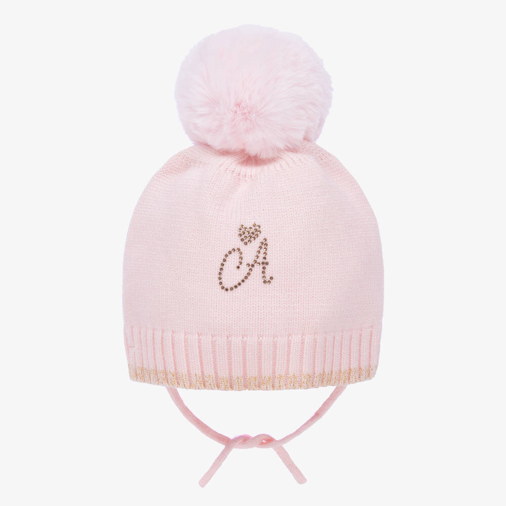 Pretty pale pink hat for little girls by Scottish brand A Dee, with a sparkling gold diamanté logo and heart on the front. Made in a super soft knitted blend, it has a detachable, faux fur pom-pom on top, secured with a popper. The ribbed brim has a glittery gold trim, with useful ties on the inside which fasten under the chin for a comfortable and secure fit.
