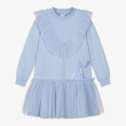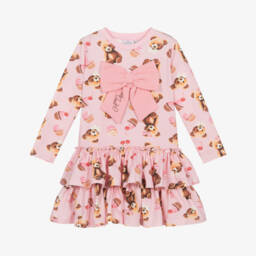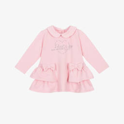 Little girls pink striped dress from Little A by A Dee, featuring a charming tiered design with subtle stripes. Made in a soft cotton blend, it offers a comfortable fit. The dress has a delicate frill at the neckline and a sweet diamanté logo on the front. Paired with matching knickers, it combines style and comfort effortlessly.