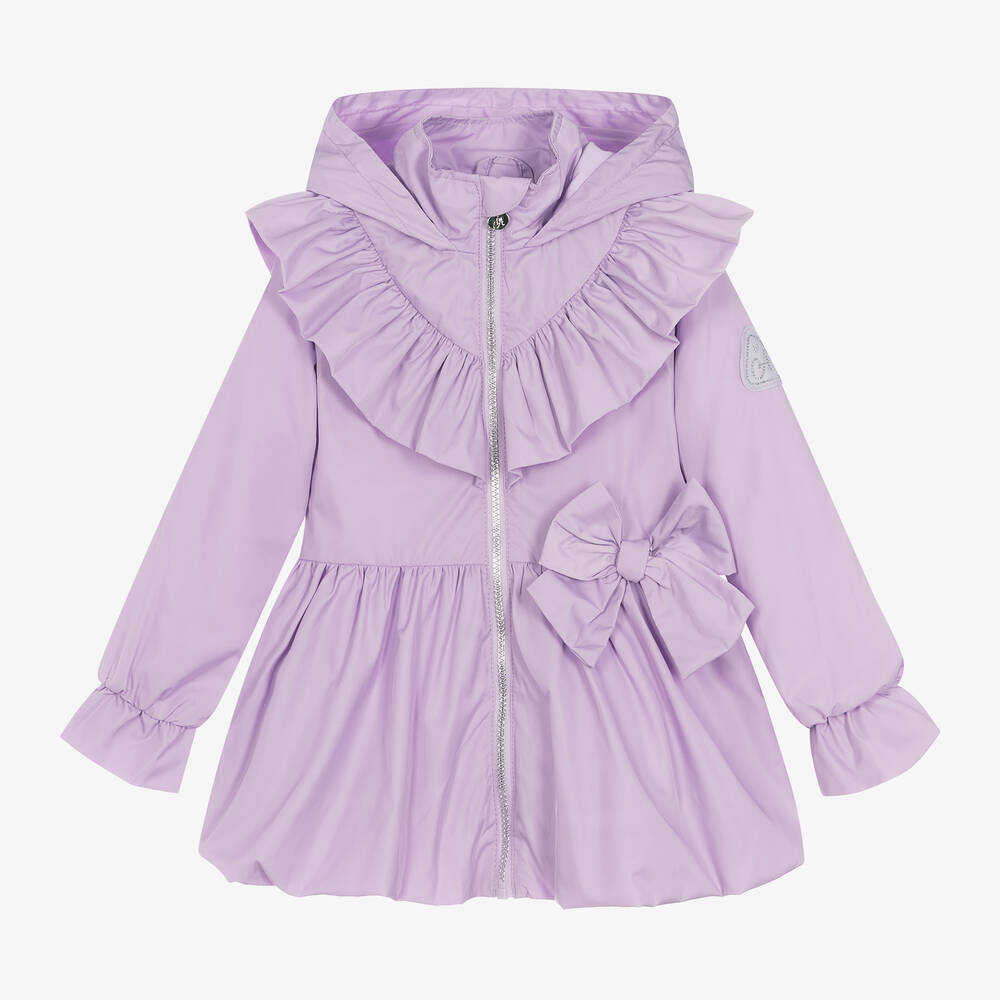 A lovely purple coat for girls by A Dee, made in a silky smooth, lightweight fabric. Lined in soft jersey for comfort, it is detailed with a pretty ruffle and decorative bow on the front. Designed in a stylish peplum shape with concealed side seam pockets, it has frilled elasticated cuffs and a shimmering silver zip fastening. For designer appeal, there is a sparkling diamanté logo patch on one sleeve.