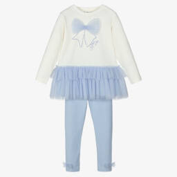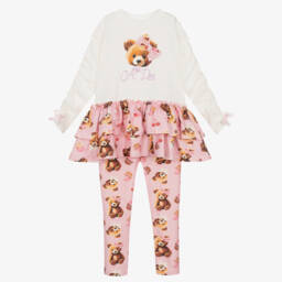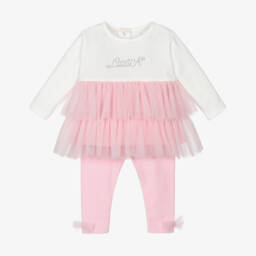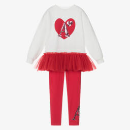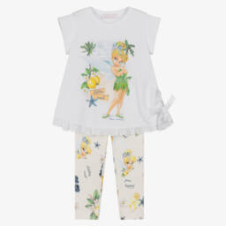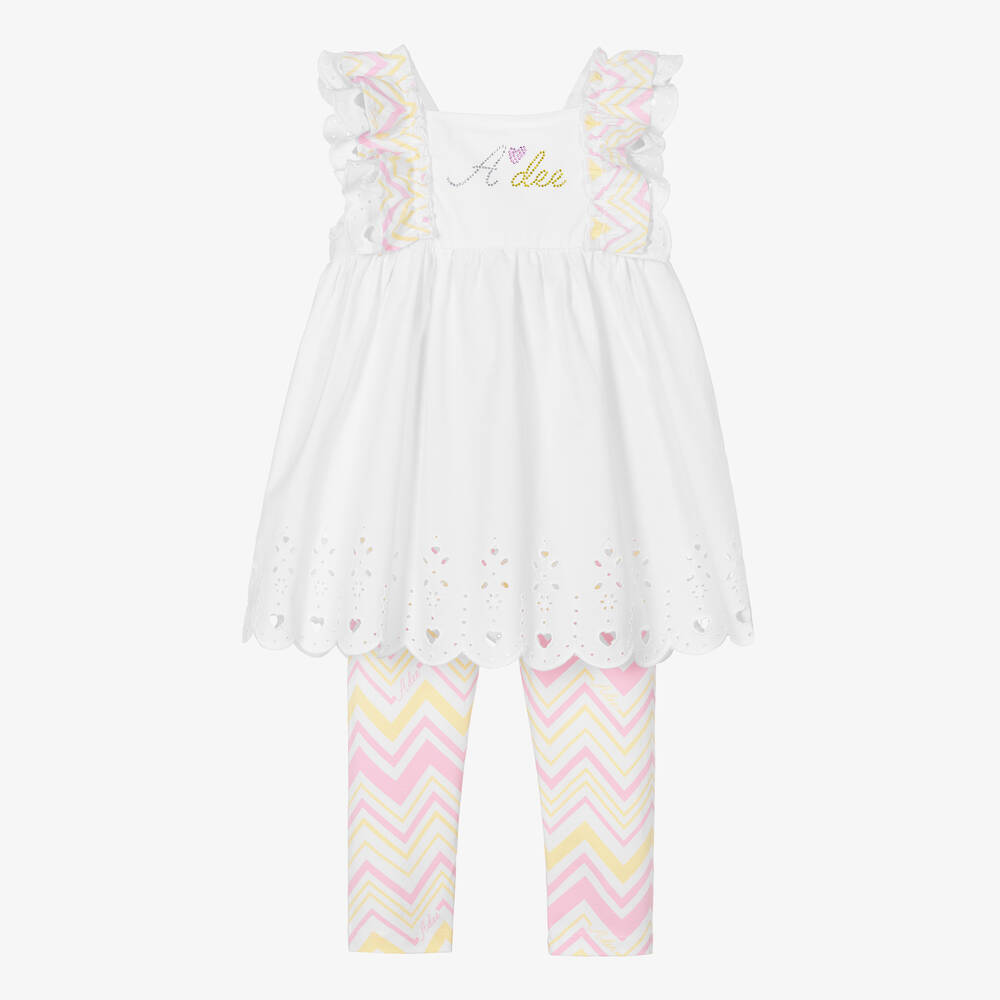 A lovely white cotton leggings set for girls by A Dee, with a pink and yellow zigzag pattern trim and leggings. Made in lightweight poplin, the tunic-length top has a broderie anglaise scalloped trim over the shoulders with matching embroidery detailing the hem. The shaped neckline allows it to pull on easily over the head, with a zigzag ruffle trim, decorative bow on the back and colourful diamanté logo on the chest completing the look. For a coordinated finish, it comes with a pair of comfortable, zigzag patterned jersey leggings.