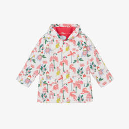 Girls pink patent raincoat with a hood by A Dee, made in polyurethane. Smooth and shiny, it has a zip fastening, with a sparkly diamanté trim, two front bow detail pockets and a gathered skirt hem. There is a logo patch on one sleeve and it is lined with soft pink polar fleece.
