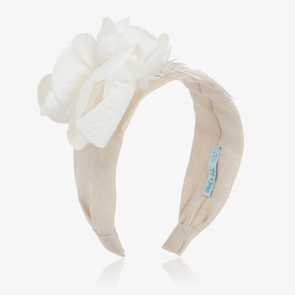 Beige hairband for girls by Abel & Lula, woven with linen-blend fabric that shimmers with fine metallic thread. This lovely hair accessory will add a finishing touch to her special occasion outfit. The wide band has embroidered leaves and an ivory flower appliqué on the top. The glittery tulle petals twinkle beautifully in the light.