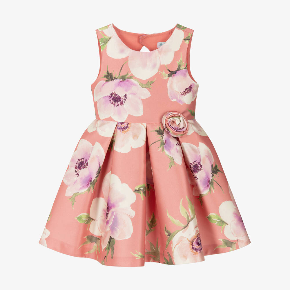 A lovely coral pink satin twill dress for girls by Abel & Lula, patterned with a beautiful floral print. Ideal for a special occasion, it has a full, box-pleated skirt and stylish open detailing on the back. A pretty 3D floral appliqué details the waist and the dress fastens neatly with a single button and a concealed zip.