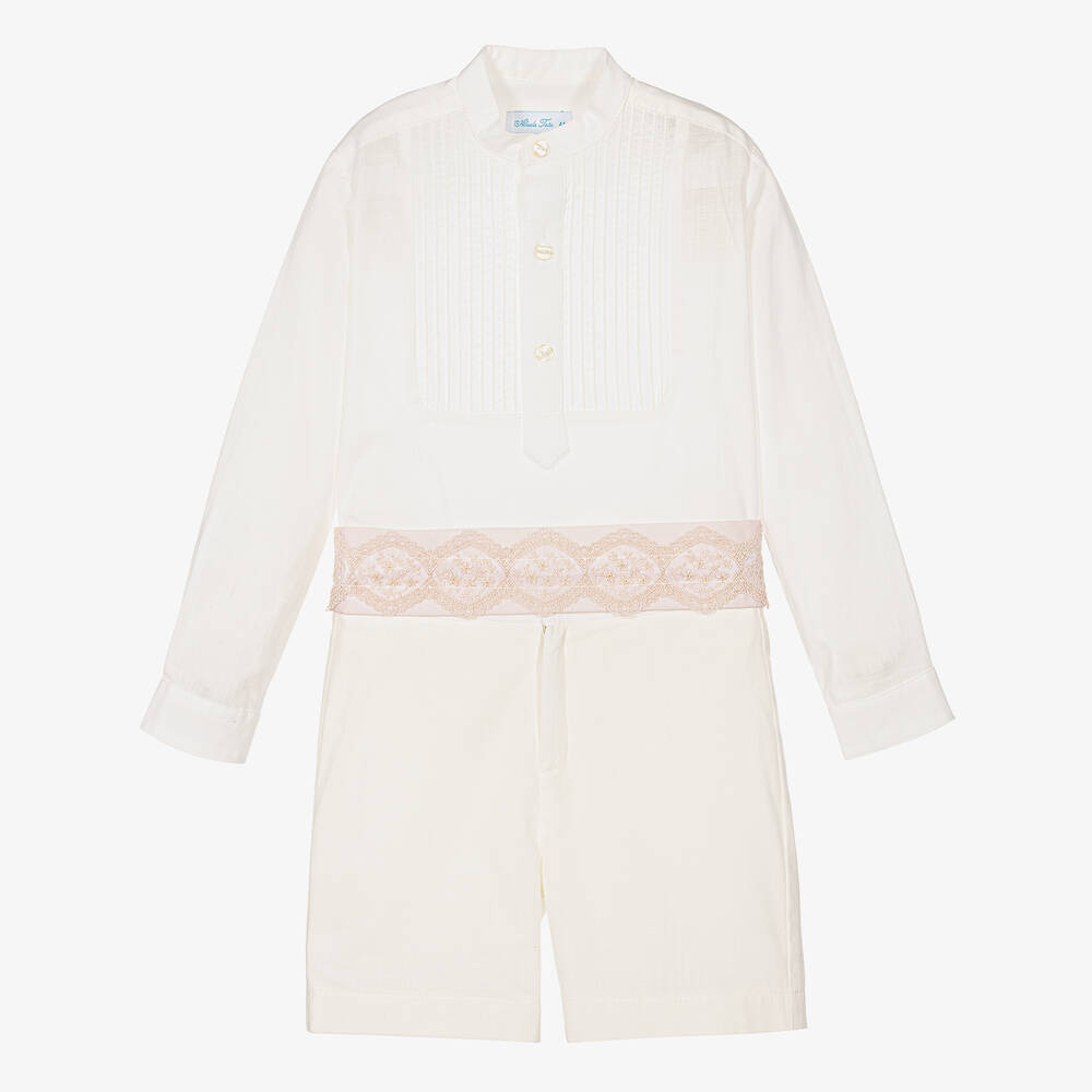 A traditionally styled shorts set for boys by Spanish brand Abuela Tata, made in soft and lightweight cotton. The collarless shirt has a pintuck pleat bib front with a half button placket, and button-fastening cuffs. The fully lined shorts fasten with a zip and button and have an adjustable waist for a comfortable fit. Lovely for a special occasion, the set comes with a removable pink and ivory lace cummerbund to complete the look.