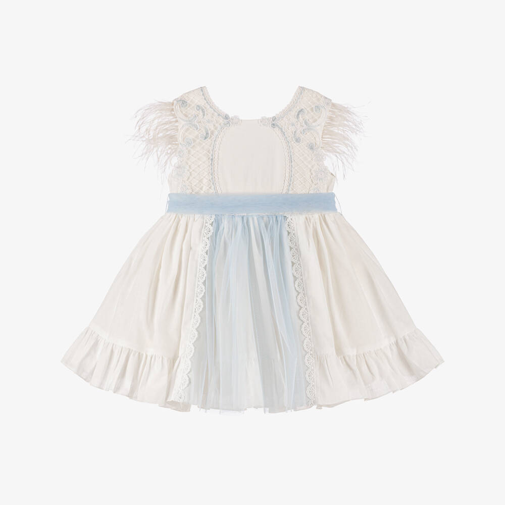 Ivory with pale blue trims, a beautiful special occasion dress for girls by Spanish brand Abuela Tata. Woven in soft cotton, this elegant design features pretty lace and tulle inserts, with delicate feather trims on the shoulders. Fully lined for comfort, the dress has a full skirt and fastens with buttons on the back. A detachable tulle sash ties into a lovely bow on the back.