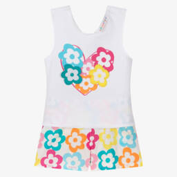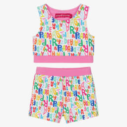 A fun cotton jersey shorts set for girls by Agatha Ruiz de la Prada. The fuchsia pink T-shirt has a bold flower motif on the front, with glittery detailing for added sparkle, and heart poppers to fasten on the back. The shorts are patterned in a colourful psychedelic flower print, with front pockets and a pretty bow decoration to finish. They fasten with a popper and have a useful adjustable waist for a comfortable fit.