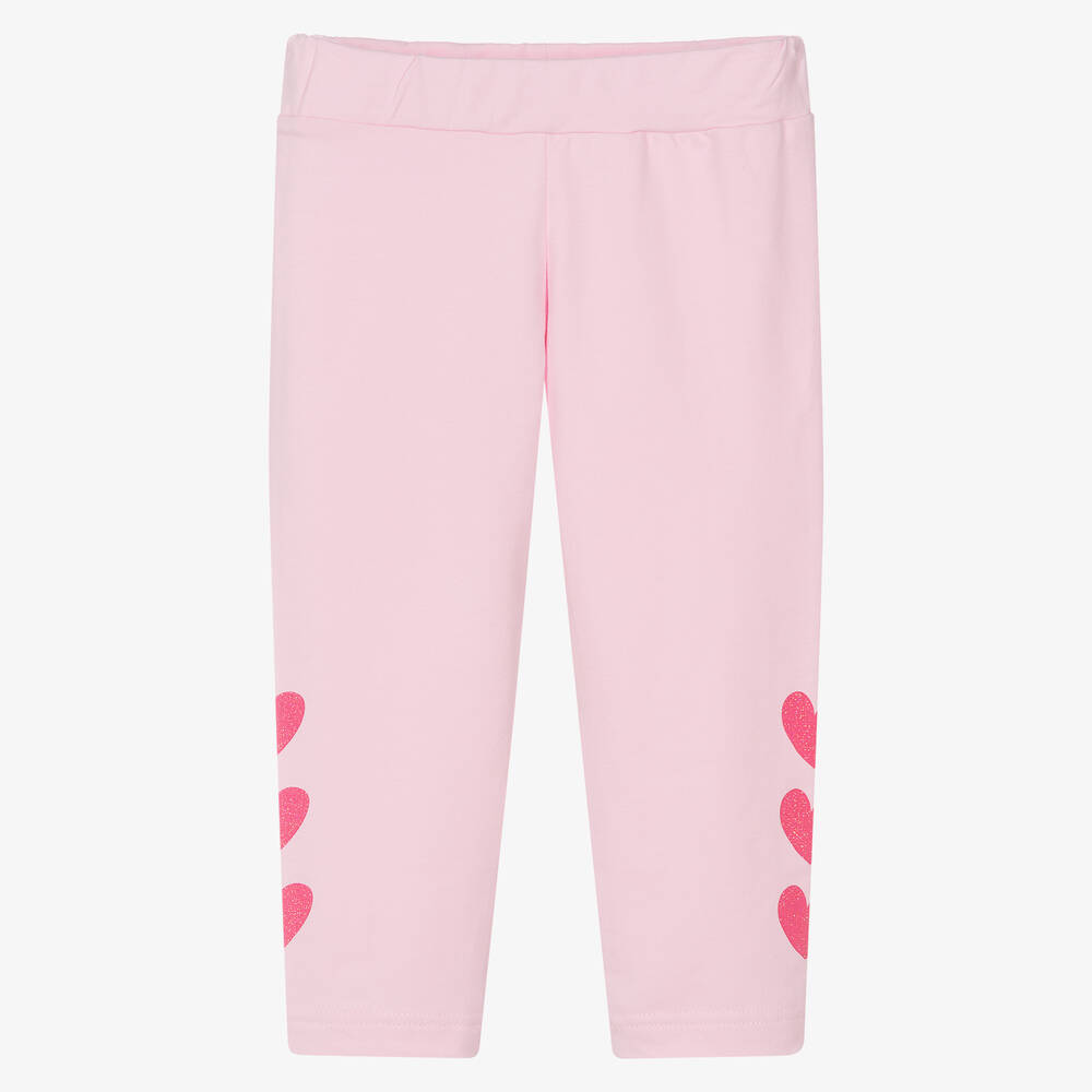 Pale pink cotton leggings for girls by Agatha Ruiz de la Prada, with glittery hearts printed on the legs in contrasting pink. Made in soft jersey with an elasticated waistband, they are endlessly comfortable to wear.
