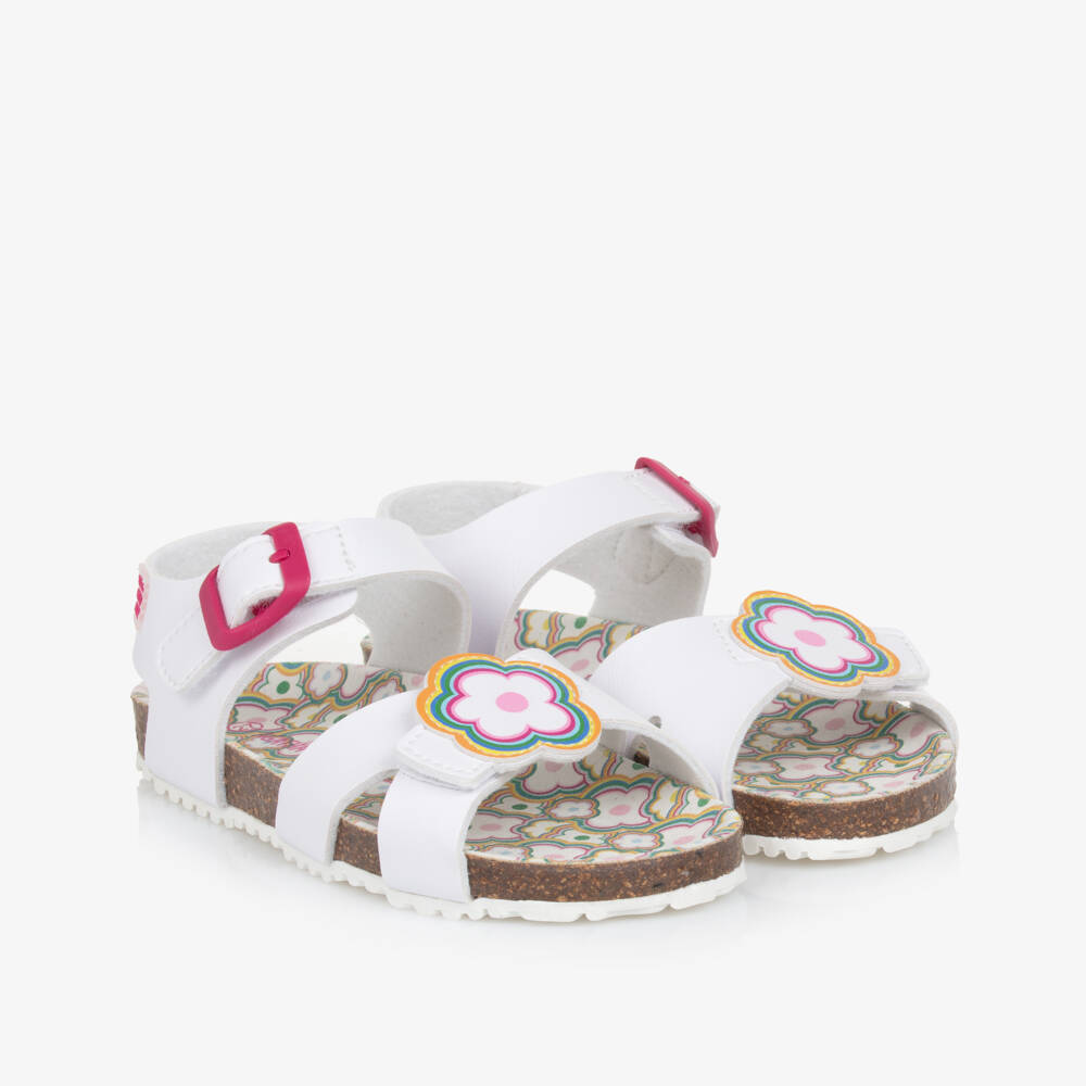 White faux leather sandals for girls by Agatha Ruiz de la Prada. Lined in a soft felt for comfort with a moulded footbed, these sweet sandals have a velcro-fastening strap across the toes with a colourful floral appliqué and a strap around the front of the ankle with a faux buckle and rubberised logo on the side. They have ridged, non-slip rubber outer soles for good grip.