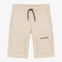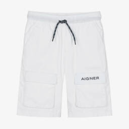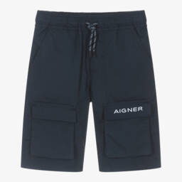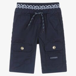 Baby boys turquoise green cotton shorts for relaxed days by AIGNER. For never-ending comfort, they are made in soft jersey with a double waistband, one with a drawstring and the other elasticated, with repeat, jacquard logos. Colourblocked with grey and white on the front pockets, they have further branding on the legs, including the signature 'A' horseshoe logo.