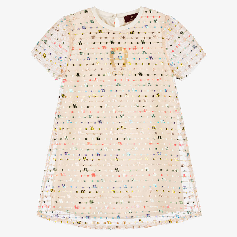 Pale pink tulle dress for girls by AIGNER, embellished with colourful sequins that sparkle beautifully in the light. Designed in a simple A-line shape, it has semi-sheer sleeves, with raw edges and a single button fastening on the back. The soft cotton jersey lining features the brand's signature 'A' horseshoe logo in metallic gold print for instant designer appeal.