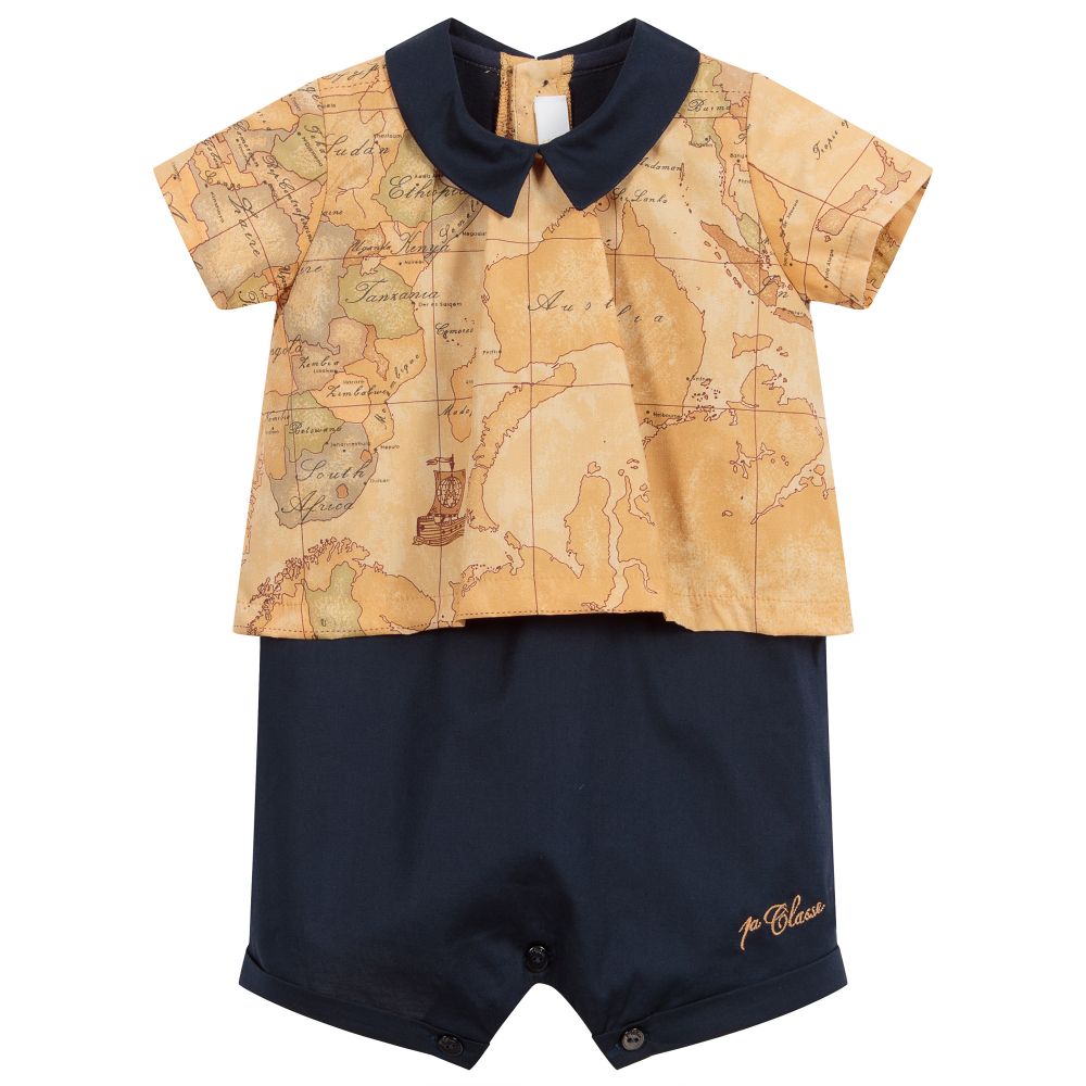 Navy blue and beige shortie for boys by luxury Italian designer Alviero Martini, made in soft lightweight cotton, The upper part is patterned in the brand's dark beige Geo map print, while the lower part is plain navy blue. The signature '1a Classe' logo is embroidered in dark beige on one leg.