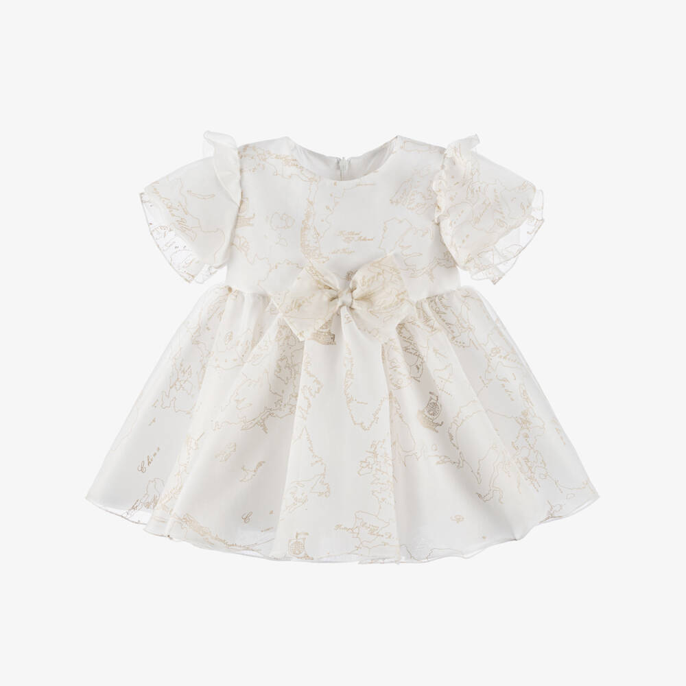 This white Alviero Martini dress for little girls is simply beautiful for a special occasion. The light organza fabric is patterned with a light beige Geo map print for a signature look. A charming bow decorates the waist, while the short frilly sleeves and flared skirt add plenty of volume. The dress is lined with soft cotton fabric and light tulle.