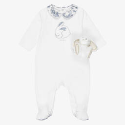 Pink bodysuit for baby girls from Angel's Face, made in soft cotton jersey. Designed with a ruffle tulle collar in pretty rainbow shades, this cute one-piece has a little grosgrain ribbon bow on the chest. There is a keyhole button fastening on the back and poppers between the legs for quick changing. A matching headband completes the sweet look.