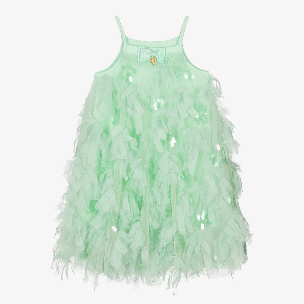 Stand out in this gorgeous mint green dress for girls by Angel's Face. The fine tulle is embellished with transparent sequins for a subtle glow amongst the feathery effect clusters. With layers of tulle creating elegant volume, this sleeveless design has a soft jersey lining for stretchy comfort and easy pull-on. The bow and heart charm add a signature touch to this stunning piece.