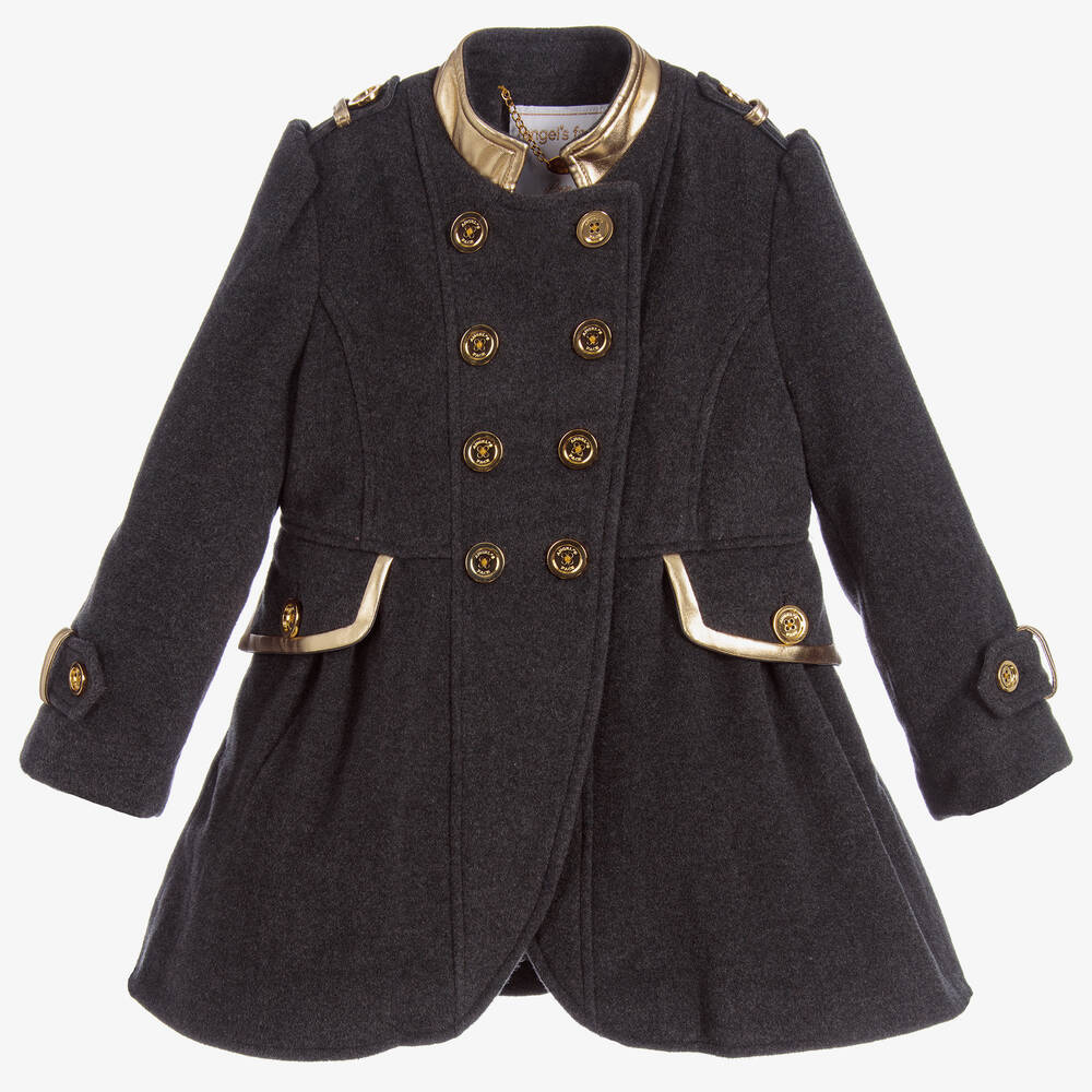 Made in a soft feel wool blend, this smart grey coat for girls, is designed by Angel's Face. In a military style, there are shiny gold trims and buttons to fasten, with matching buttons on the cuffs and pocket flaps. It has a gently fitted waist and flare, with a luxurious red satin lining.
