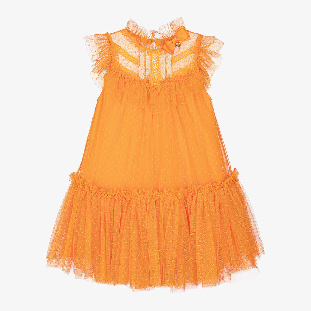 Stunning orange special occasion dress for girls by Angel's Face. Made in soft plumeti tulle, it has delicate ruffles on the bodice and a floaty shape. The designer's signature gold charm and bow accents the chic high neckline, and it is lined in soft cotton jersey for ultimate comfort against the skin.