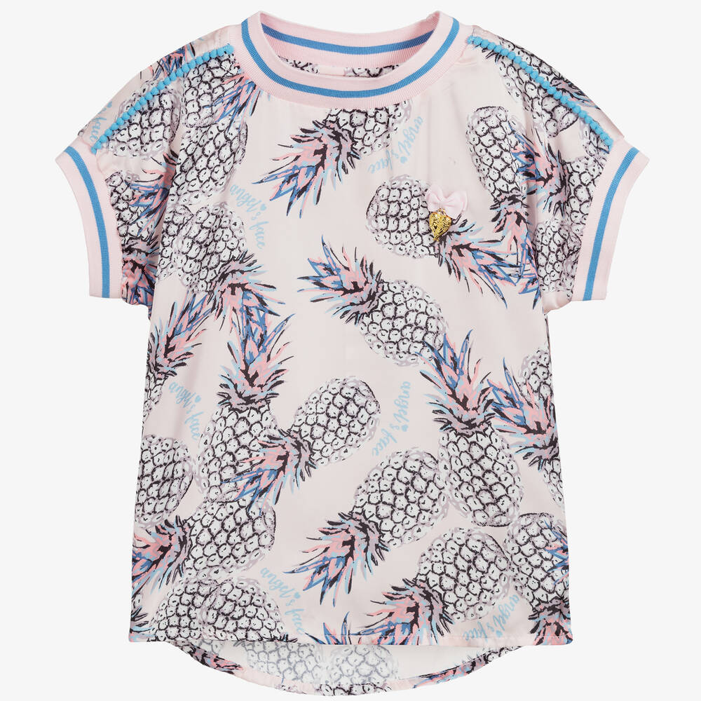 Girls pink top by British brand Angel's Face, made in silky smooth satin. It has an allover pineapple print with blue pom-pom trims, and the signature double bow and gold wings charm on the chest.