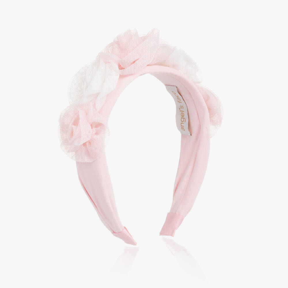 A lovely pale pink hairband for girls by Angel's Face. It is decorated with pale pink and off-white tulle flowers on the top, adding a gorgeous finishing touch to any outfit. Covered in soft jersey, the wide, flexible band sits comfortably on the head.