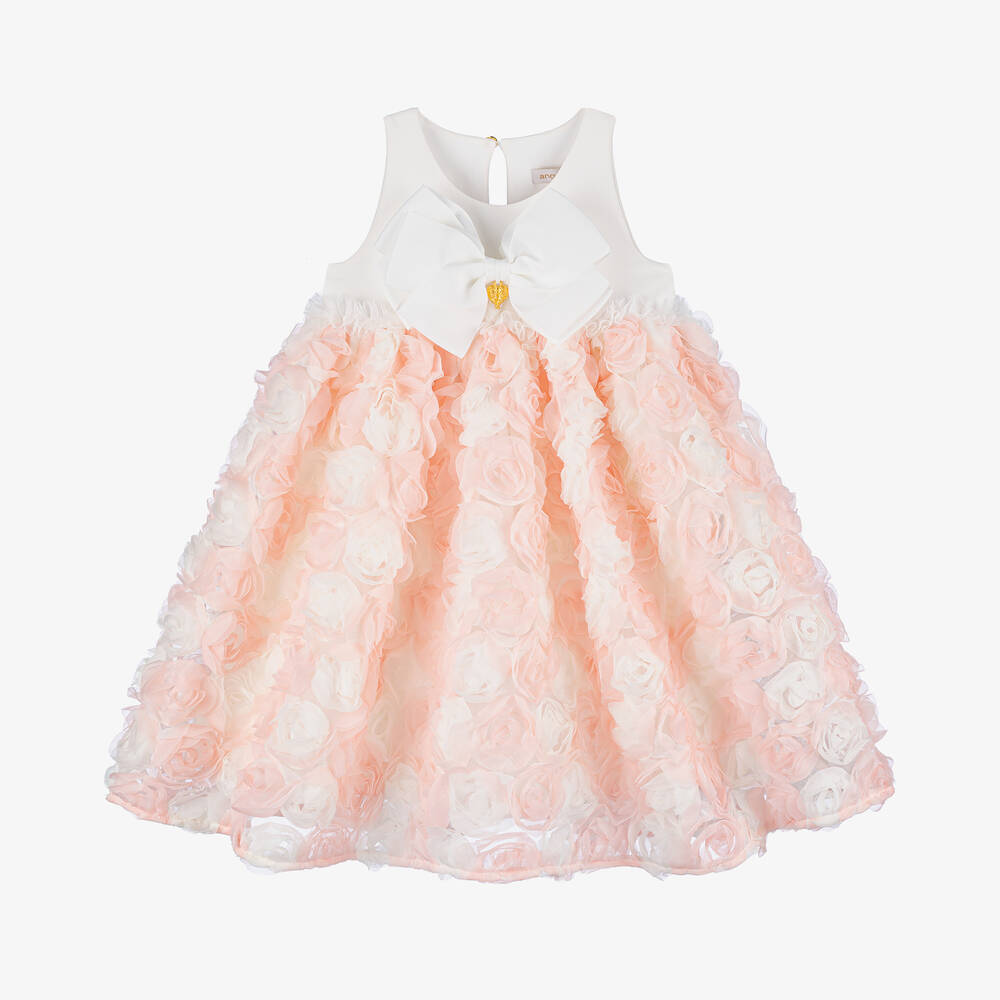 A pretty off-white and pale pink dress for girls by Angel's Face, made in soft and stretchy jersey. Lovely for a special occasion, this sleeveless dress has a voluminous skirt with romantic tulle roses for textural detail. It has an oversized grosgrain bow on the bodice with a signature gold heart charm in the centre. A keyhole button fastening adds neat detail to the back of the neck.