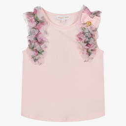 Beautifully sparkly, this bright yellow sleeveless top for girls by Angel's Face, is made in soft jersey, with a fine tulle overlay covered in multicoloured sequins. Trimmed with ruffles, it features the brand's signature heart charm and bow and fastens with a stylish keyhole button on the back.
