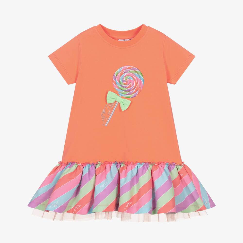 A coral orange T-shirt dress by A Dee for girls, with a soft cotton jersey bodice and silky smooth skirt. A striped lollipop illustration on the chest and the diamanté logo give a touch of sparkle to this comfortable dress. The flared skirt is patterned with multicoloured stripes and has a tulle underskirt for added volume.