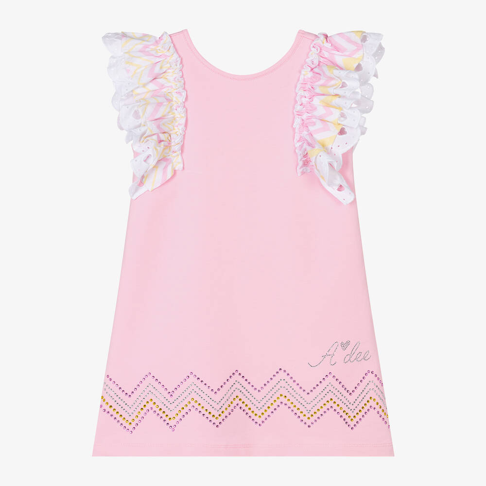 Pretty pink A-line dress for girls by A Dee, made from soft cotton jersey. Embellished with a colourful branded diamanté design on the front, it has layered frill short sleeves and a pink and yellow zigzag patterned bow detail on the low V-back. Easy to wear, the dress simply slips over the head.