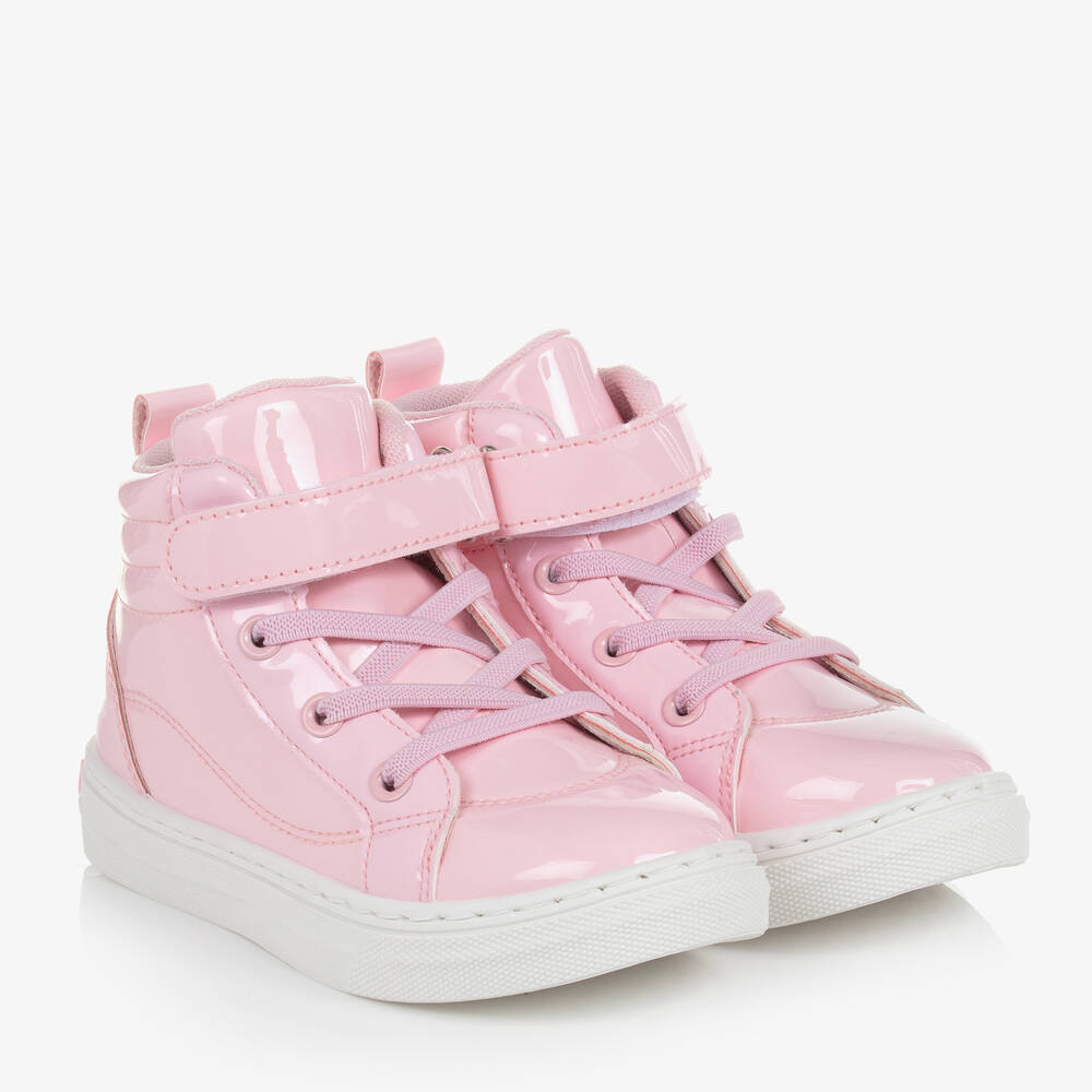 Pink high-top trainers for girls from A Dee, made in soft patent faux leather. These comfortable trainers have elasticated laces and heel pull for easy slip-on, with a velcro strap for an adjustable fit. They have a breathable mesh lining with a lightly cushioned insole and for designer appeal, there is a logo patch on the back of the non-slip rubber outer sole.