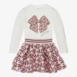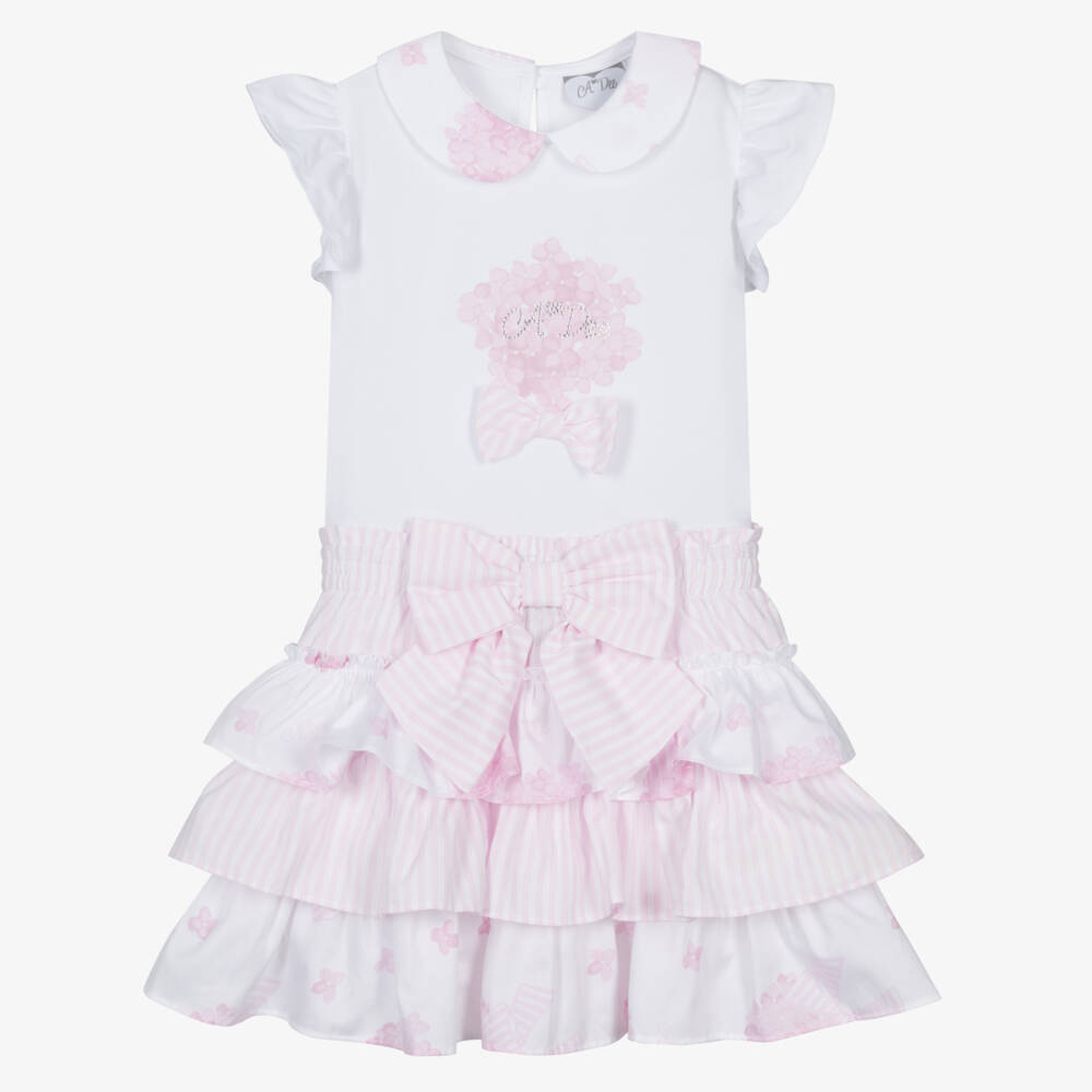 A lovely white and blossom pink skirt set for girls by A Dee. The jersey T-shirt has frilly sleeves, a patterned collar and a neat keyhole button on the back of the neck. There is a floral bouquet printed on the front with a fabric bow stitched below. The matching skirt has a beautiful layered silhouette in contrasting stripe and floral patterns. The waistband is elasticated for added comfort.