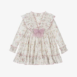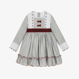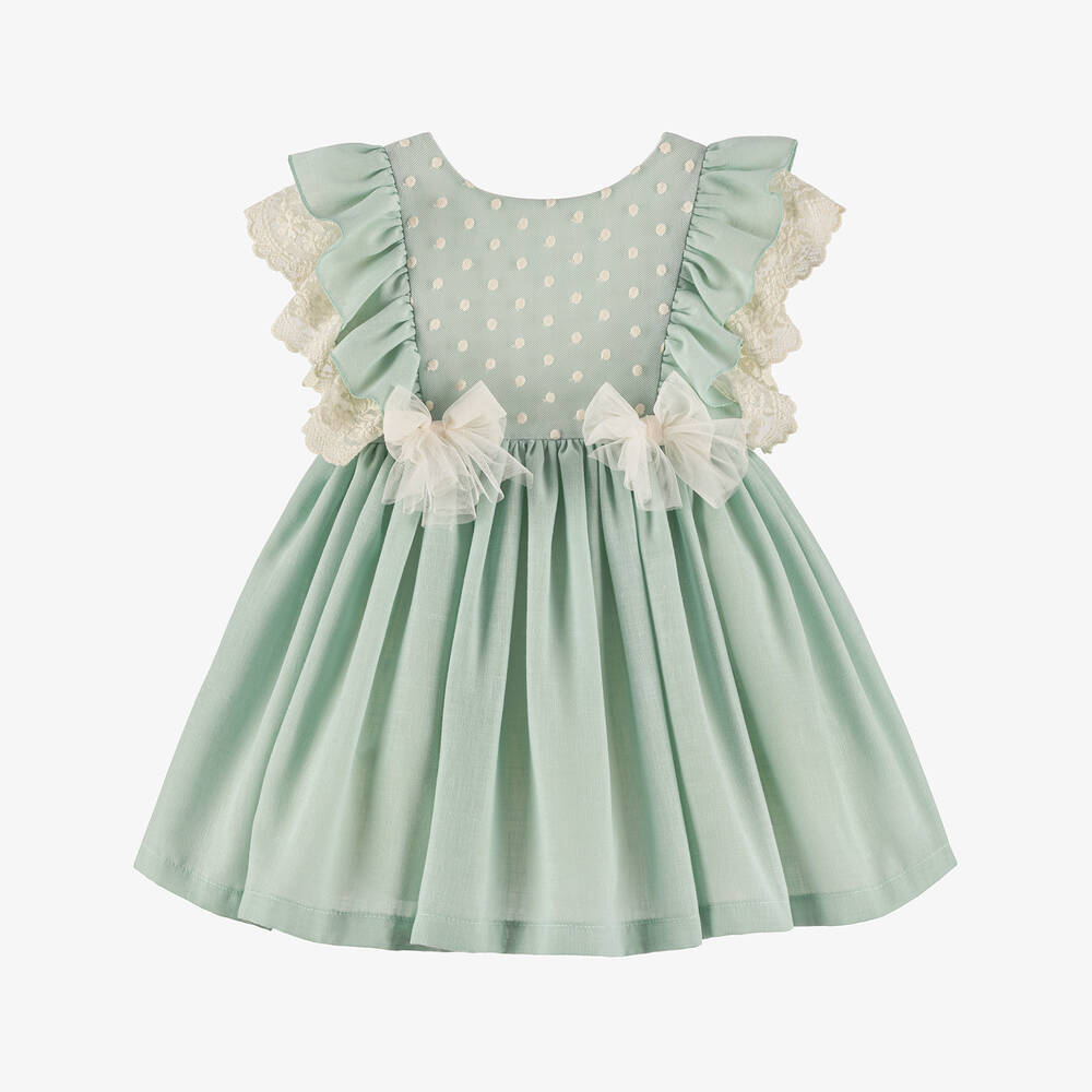 Girls delightful linen-look green dress for special occasions by Abuela Tata, with eye-catching ivory lace ruffles over the shoulders and tulle bows on the waist. Designed with ivory polka dots on the bodice and a stylish low-cut back, it has a full, flouncy skirt and a tulle sash that ties in a large, flamboyant bow.