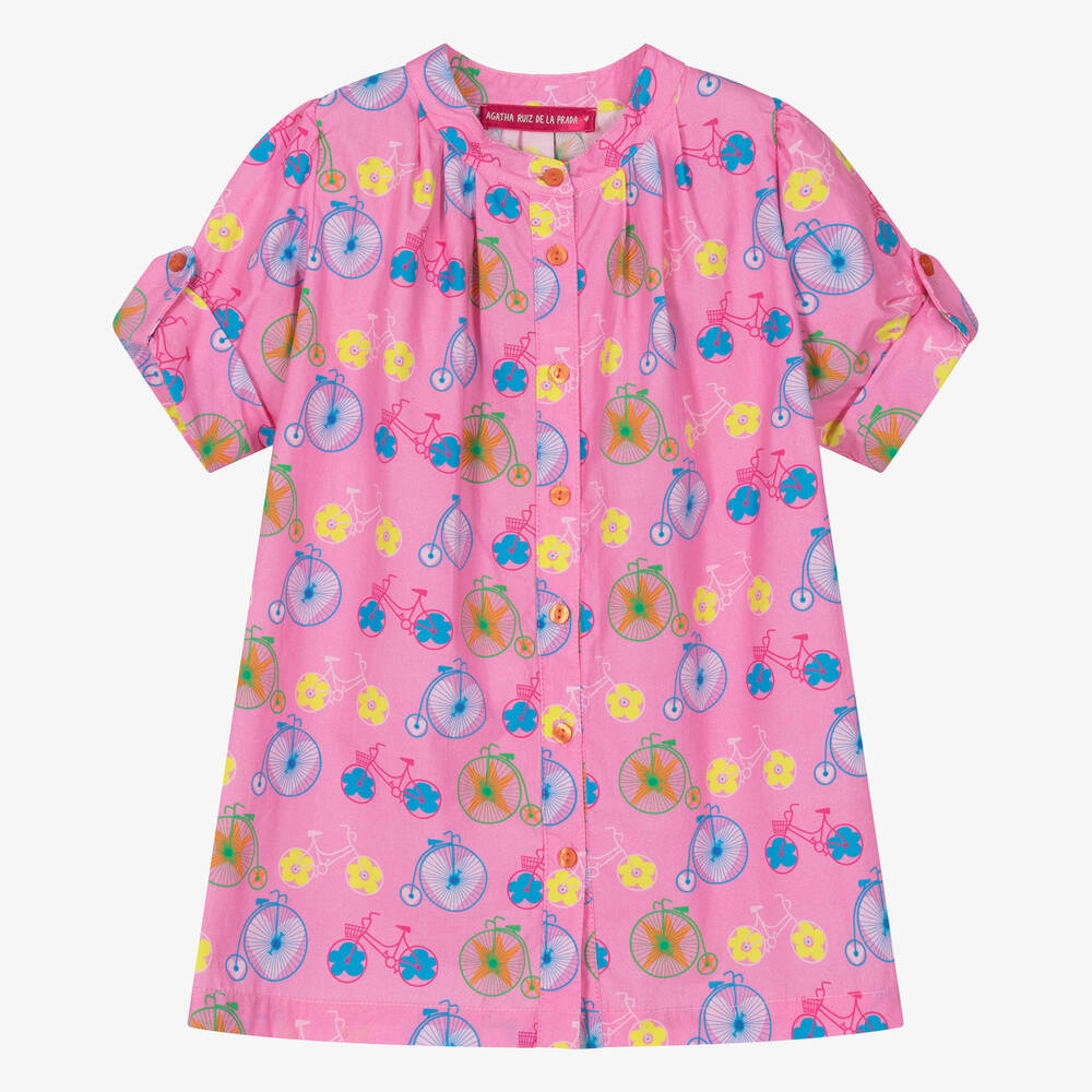 Beautiful pink cotton dress for girls by Agatha Ruiz de la Prada, patterned with colourful bicycle prints for a signature look. This comfortable poplin dress is pleated from the neckline for a casual, flared silhouette and fastens with branded buttons on the front. The elbow-length sleeves can be rolled up and secured with a button tab.