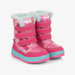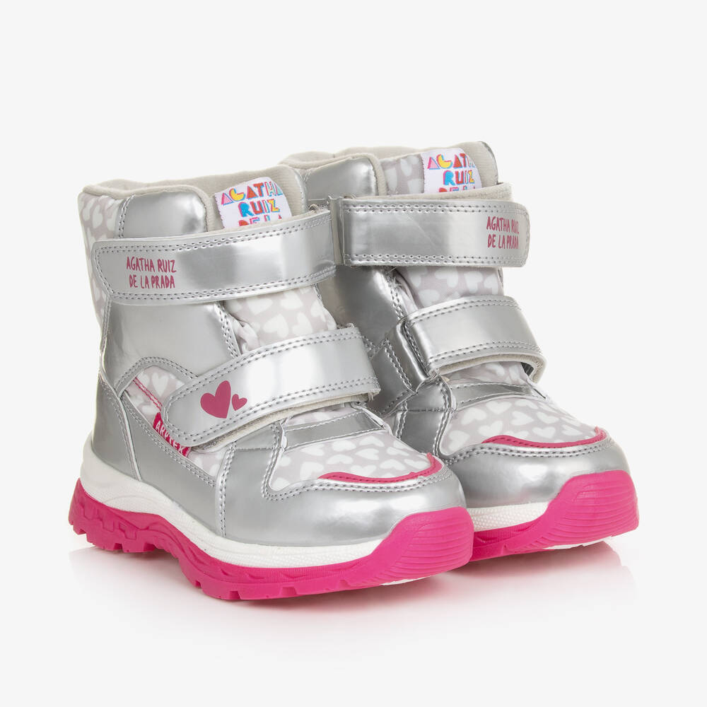 Gorgeous silver snow boots for girls by Agatha Ruiz de la Prada, made in soft textile with metallic silver faux leather trims. Patterned with little white hearts, these stylish boots have a contrasting pink logo print and heart design on the velcro fastening straps. Protecting against wet and cold weather, they are lined in soft fleece for warmth, with a chunky, pink rubberised outer sole providing good grip and a coordinated finish.