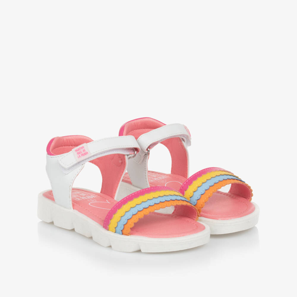 Colourful sandals for girls by Agatha Ruiz de la Prada, made in soft faux leather, with a pretty,scalloped, rainbow effect layered strap across the toes. They fasten with a velcro strap across the front of the ankle, which features a rubberised logo. The footbed is lightly cushioned for comfort and they have chunky, non-slip rubber outer soles for good grip.