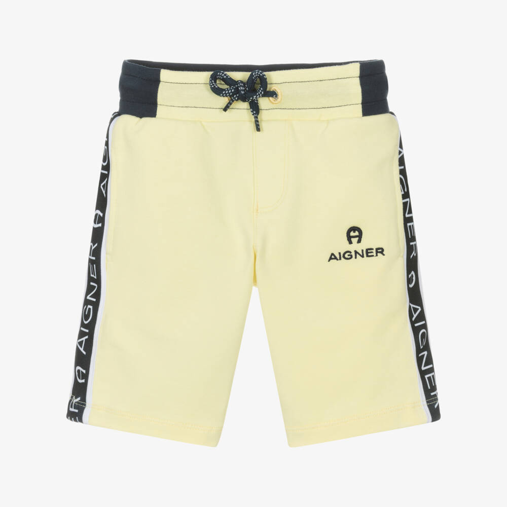 Yellow shorts for baby boys by AIGNER, made in soft, mid-weight cotton jersey. There are navy blue and white logo tape trims on each leg and the signature 'A' horseshoe logo embroidered on the front in navy blue. There are side seam and back pockets and a useful drawstring waist for a comfortable fit.