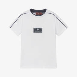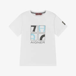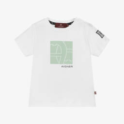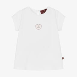 Comfortable white cotton T-shirt for baby girls by AIGNER, made in soft, stretchy jersey. It has a pretty butterfly and logo print on the front in shades of pink and pale orange.