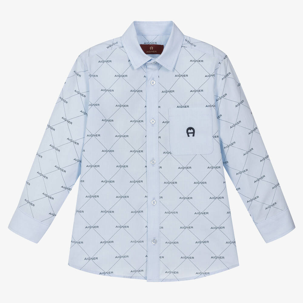 Pale blue shirt for boys by AIGNER, woven in lightweight cotton. It has a smart diamond-shaped logo pattern in navy blue, with the designer's signature 'A' horseshoe embroidered on the chest pocket in matching blue. It fastens with branded buttons on the front and cuffs.