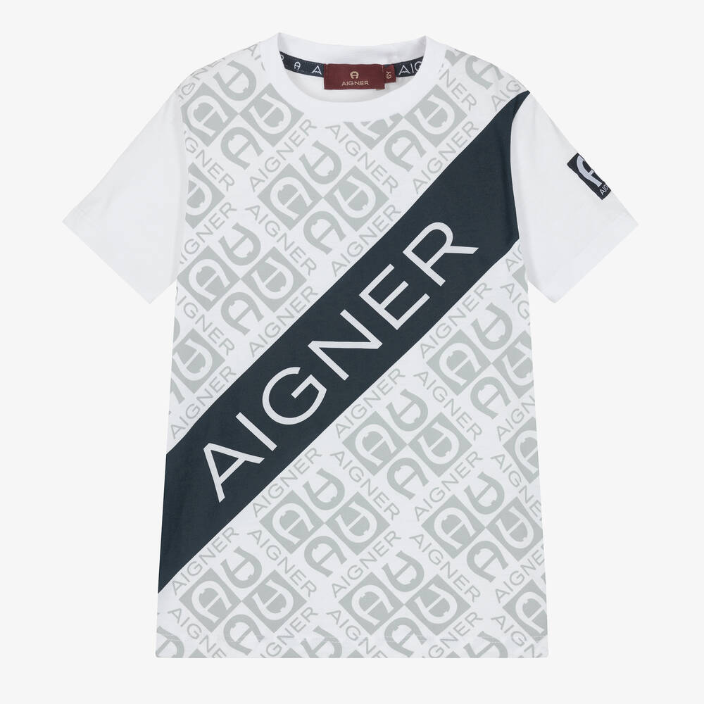 Endlessly comfortable white cotton T-shirt for boys by AIGNER, made in soft, stretchy jersey. It has brand appeal too, with a bold navy blue logo print and signature 'A' horseshoe logos repeated behind in grey.