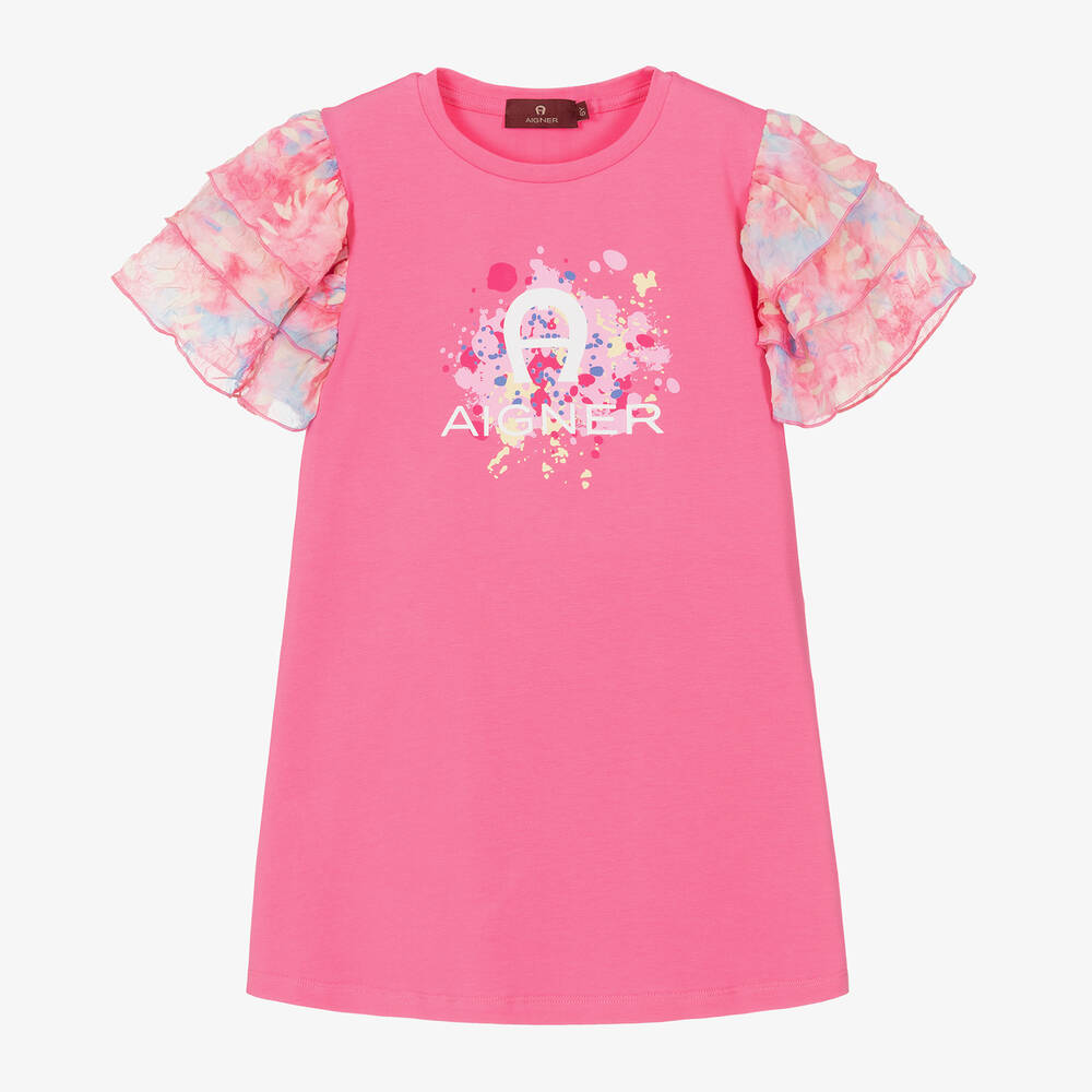 Fuchsia pink dress for girls by AIGNER, made in soft cotton jersey. Printed with the designer's signature 'A' horseshoe logo on the front with a colourful paint splatter design, it has sheer, chiffon sleeves with a pretty pastel print and cute ruffles.