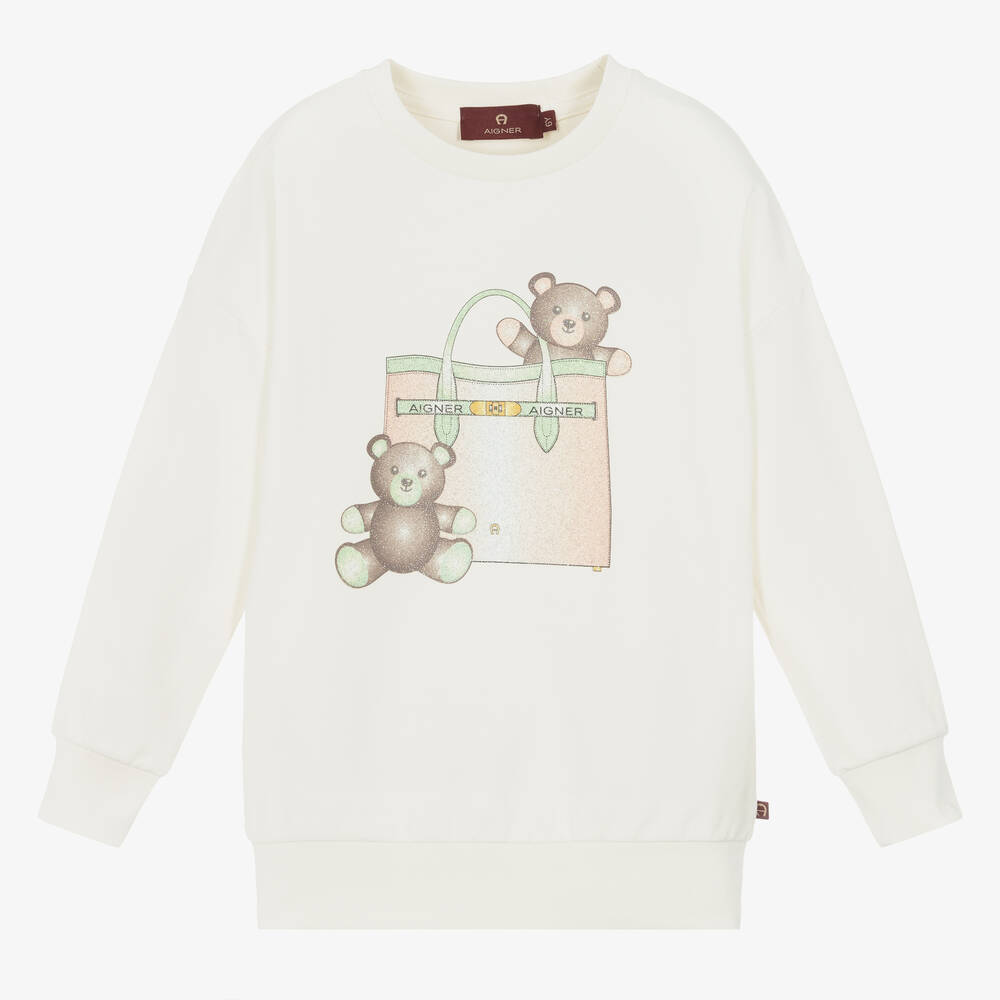 Lovely ivory sweatshirt for girls by AIGNER, made in soft cotton jersey. It has a cute, glittery print of the brand's Farah bag with two teddy bears in shades of pastel pink and brown. This casual top has a relaxed fit with dropped shoulders for comfortable wear.