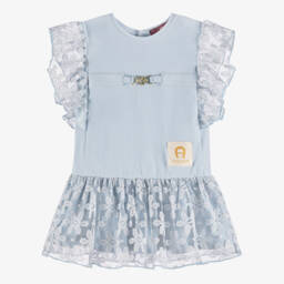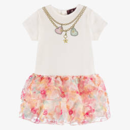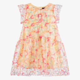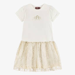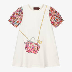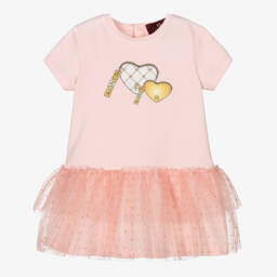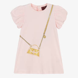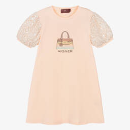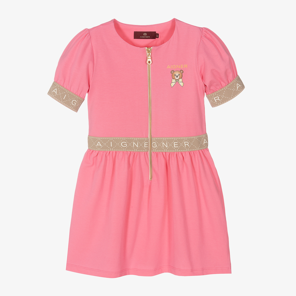 Bubblegum pink dress for girls by AIGNER, made in soft cotton jersey, for a casual and comfortable look. This pretty dress has a gold zip fastening down the front making it easy to get on, with puffed sleeves and a sparkly teddy bear motif on the chest. There are beige elasticated trims, patterned in the designer's name.