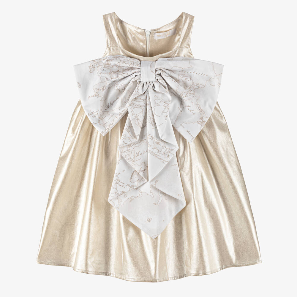 Beautiful metallic gold special occasion dress for girls by Alviero Martini, ideal for making an entrance in. Made in shimmering, slightly stretchy cotton, the bodice has a strikingly large ivory bow with the designer's signature Geo map print, adding a touch of sophistication. The gathered skirt has a full silhouette and is lined for comfort.