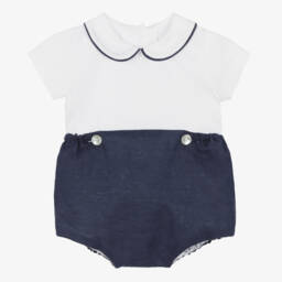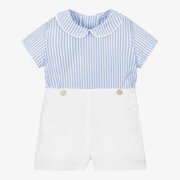 Little boys green and white cotton shorts set by Ancar, made exclusively for Childrensalon. Traditionally styled, the lightweight shirt has a Peter Pan collar, green trims and mother-of-pearl buttons on the front. The coordinating shorts have a lightweight lining, turn up hems and are partly elasticated at the waist for comfort. Both pieces button together for a neat and tidy look.