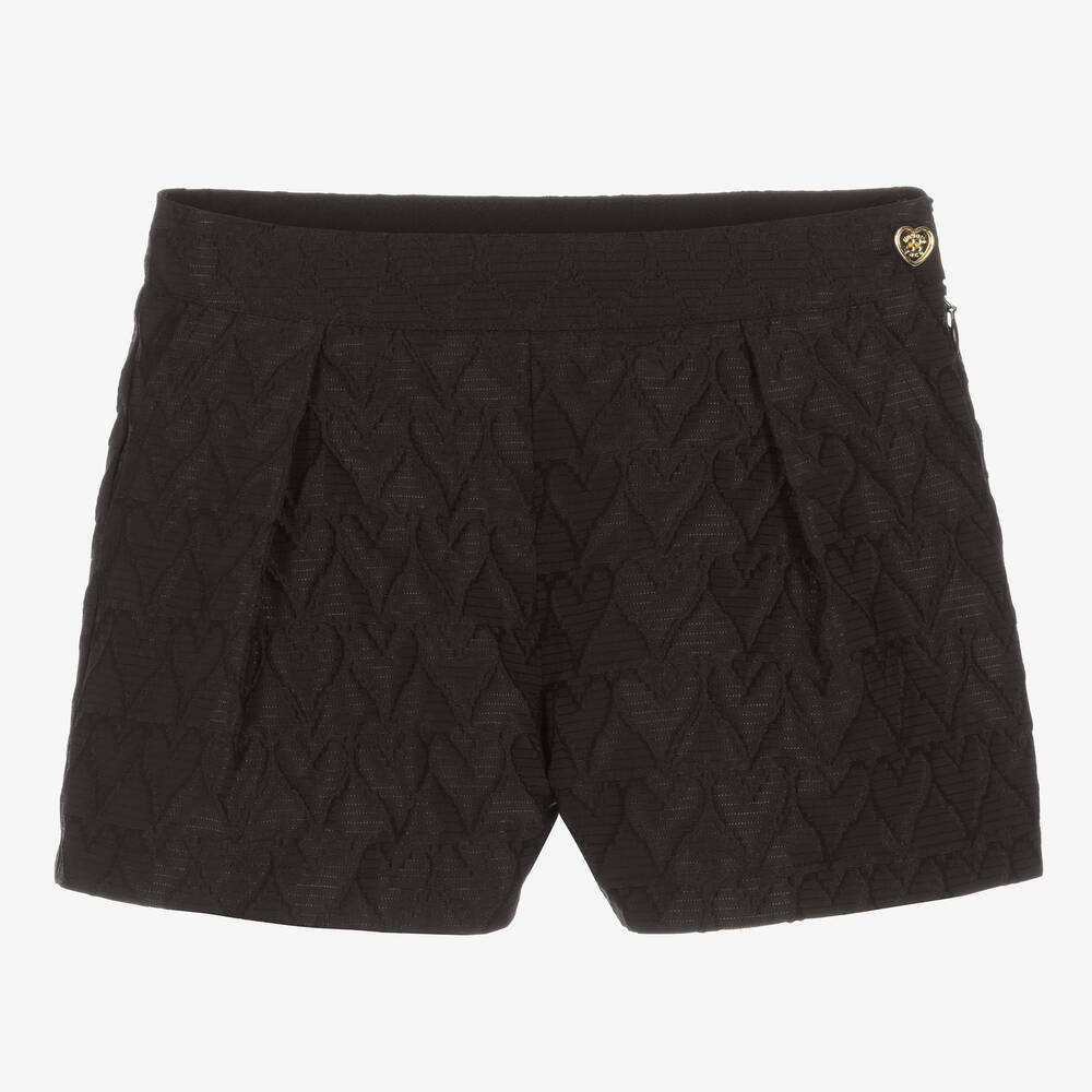 Gorgeous black special occasion shorts for girls by British brand Angel's Face. Made in lightweight jacquard with a cool heart pattern, they have a useful, adjustable waistband for a comfortable fit. They fasten with a golden, heart-shaped logo button on one side, with a neat, concealed zip fastening. They have stylish, inverted pleats and pockets on the front.