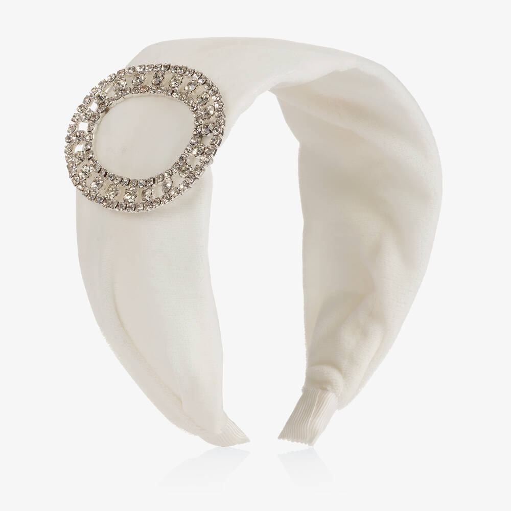 Ivory velvet hairband for girls by Angel's Face. Ideal for adding a sparkling touch to any outfit, it has a super sparkly oval diamanté brooch detail. The wide flexible band is comfortable on the head for easy wear.