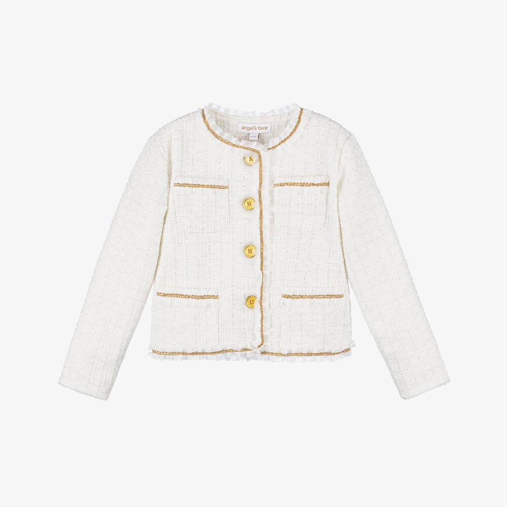 Chic off-white jacket for girls by Angel's Face, made in luxe tweed with a silver shimmer. Fine tulle ruffles and gold thread accent the style. There are embossed gold buttons on the front and it has a silky lining for comfort.