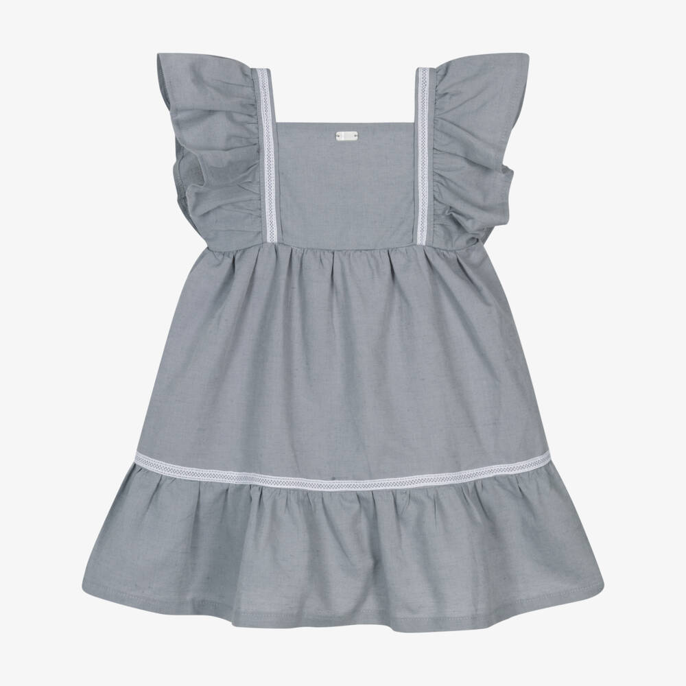 A lovely grey dress for girls by Babidu, made in softly woven cotton. This charming, classic look has a square neckline, delicate white lace trim and pretty ruffles over the shoulders. Lined with voile for comfort, the dress is elasticated across the back and a charming white muslin bow adds a pretty finish.