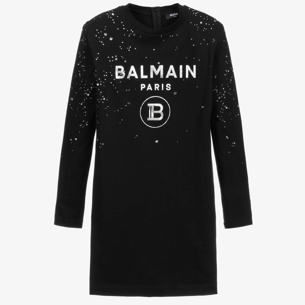 Teen girls black dress by luxury brand Balmain, with a silver Balmain Paris logo print. This versatile jersey dress is decorated with sparkly gems, allowing it to make the transition from day-wear to special occasion with ease.
