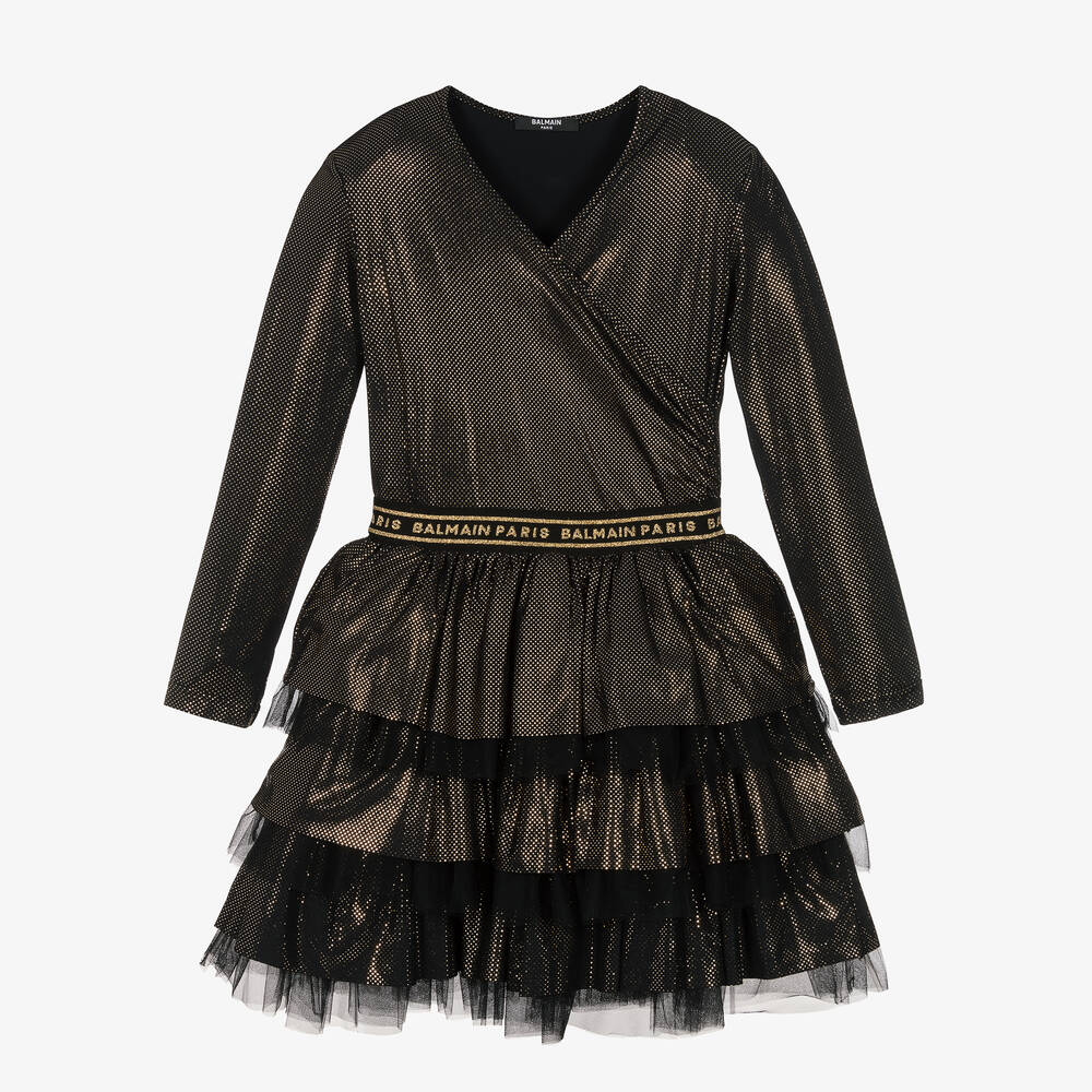 A striking black dress for teen girls by luxury French label Balmain. Ideal for parties or other special events, this modern design has a cross-over bodice and sparkles in the light with gold foil spots. It has full, padded shoulders for a sophisticated look and an elasticated waistband highlighted by a glittery gold repeat logo. Fully lined, the ruffled skirt is layered with soft tulle for added movement and shape.