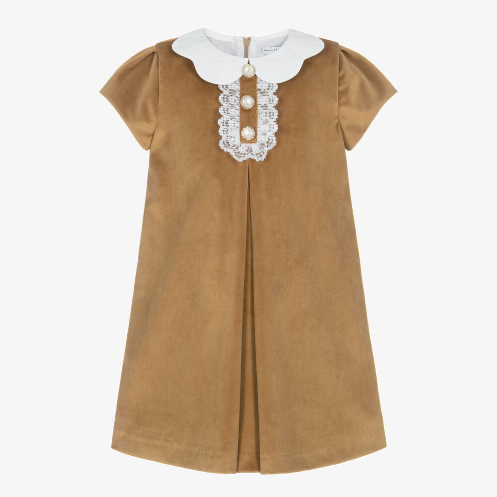 Exclusive to Childrensalon, a sumptuous, dark gold, special occasion dress for girls by traditional British brand Beatrice & George. Made in super soft velvet, it has a scalloped, white poplin collar and a decorative, lace-trimmed placket on the bodice, with pearly buttons edged in sparkling diamantés.