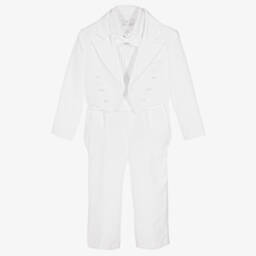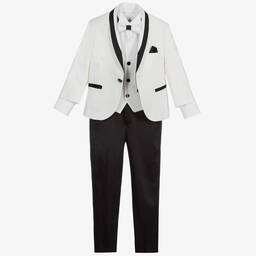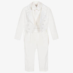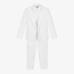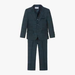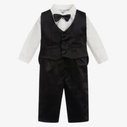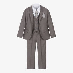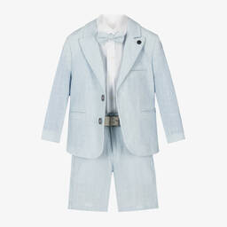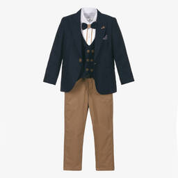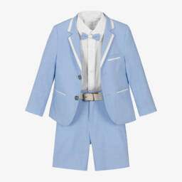 A smart tan brown and navy blue shorts suit for boys by Beau KiD. The linen-look jacket is woven in soft cotton and has a silky satin lining. It has front pockets and a stylish pocket square detail. The shorts are made in smooth cotton twill and have an adjustable waist for an ideal fit. They have front and back pockets, and come with detachable ivory and beige buckle belt. The white cotton-blend shirt is woven with a subtle pattern and comes with an adjustable brown and blue bow tie for an elegant finish.