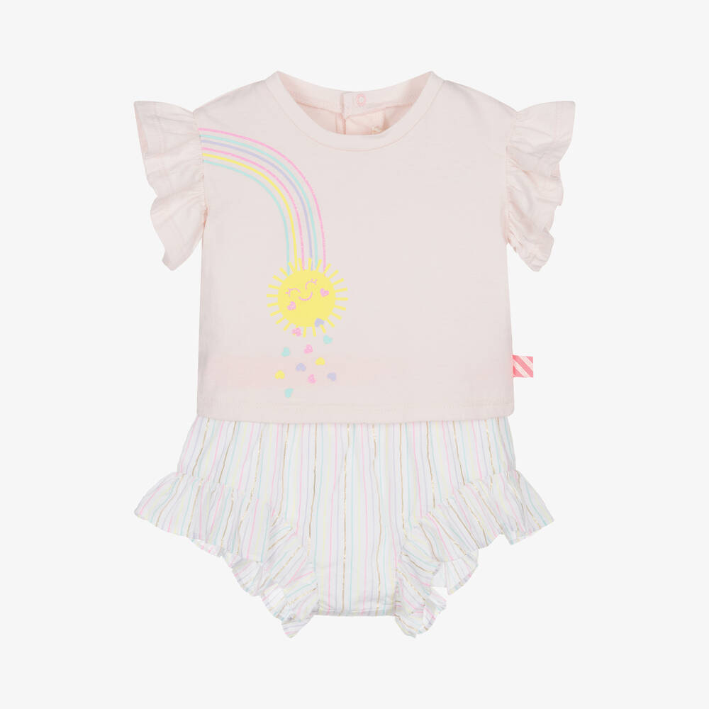 Cute pink shorts set for baby girls by Billieblush, made in soft cotton for cool, comfortable wear. The jersey top has short ruffled sleeves and a colourful sun, rainbow and heart motif on the front. It fastens with poppers on the back. The lined white shorts have a co-ordinating striped pattern with ruffle trims on the legs and a glittery pink elasticated waistband for a sparkly finish.